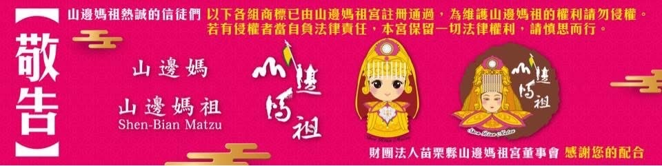 在此呼籲衆信們一起維護白沙屯拱天宮的著作及智慧財產權同時,也向各位報告山邊媽祖宮在109年也已核准以下註冊商標,"山邊媽祖宮"五個字在114年5月也商標核准了,相信各位信眾基於愛媽祖的底蘊下一樣會一起來維護山邊媽祖的著作及智慧財產權。至於少數信衆在別的粉絲團或fb的侵權行為履勸不聽,若再不修正,本宮不排除法律行為以儆效尤,請配合,謝謝。